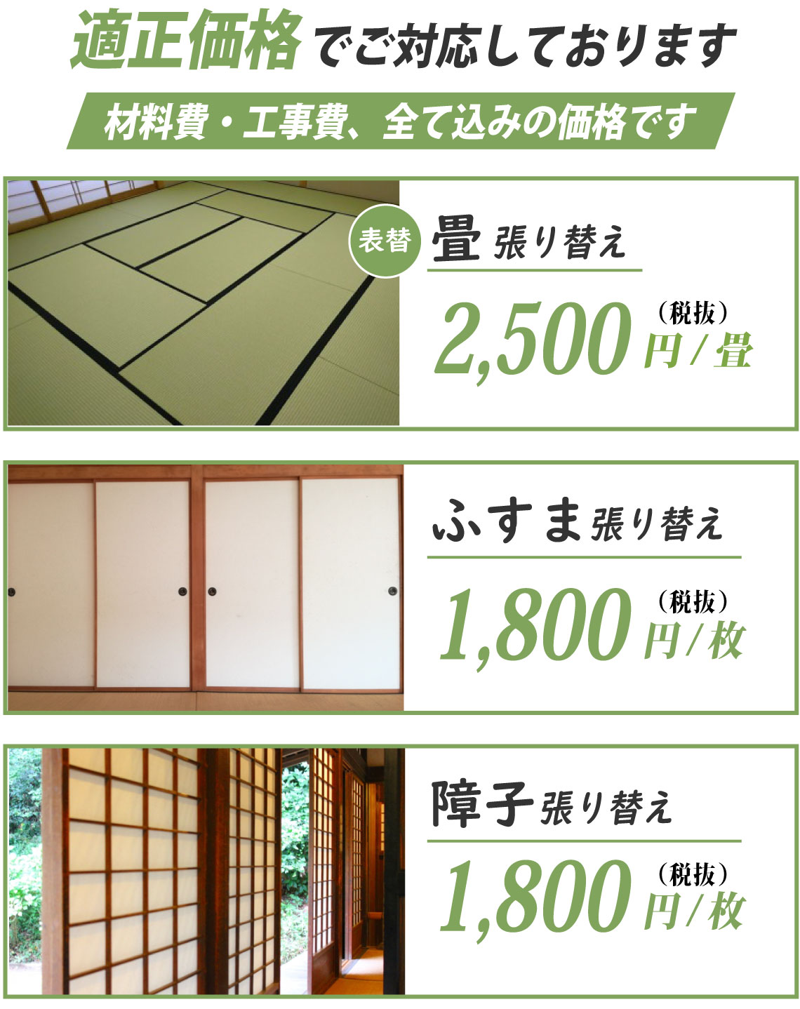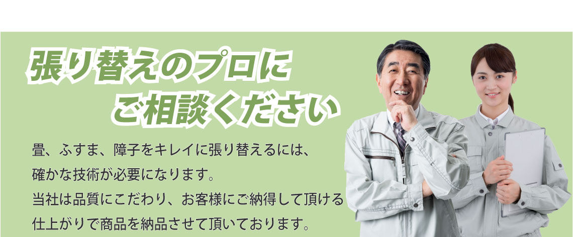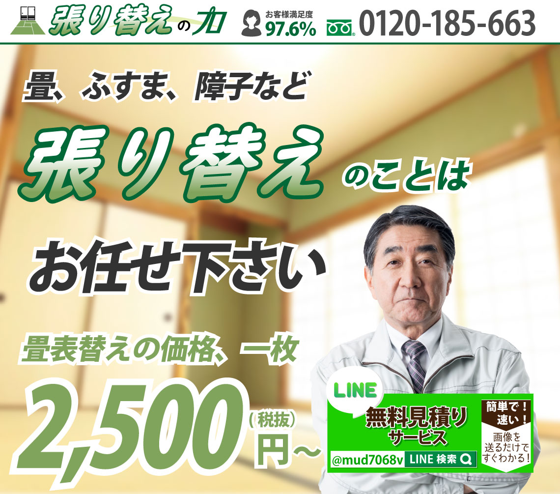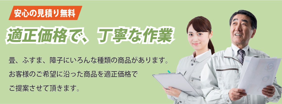 畳、襖、障子の経年劣化(破れ、汚れ、日焼け、変色など)が目立ってきたら、張替えが必要になります。しかし、張替えといっても一年に何度も行うものでもないので、なじみがない、不安といった方も多いのではないでしょうか。わからないからと適当に依頼してしまうと思わぬ出費になってしまうこともあります。そこで畳、襖、障子の張替えを適正料金で安心して依頼するためのポイントをご紹介します。張替えは畳(襖、障子)の状態や数量などによって、それぞれ対応が異なるため、一律で何円とは言えません。ただ問い合わせの前におおまかでいいので相場を調べておくと料金のイメージがつかみやすくなります。そして、まずは気軽に問い合わせをしてみましょう。多くの業者が無料で相談を行っています。ここで業者のヒアリング、回答、返答が丁寧で的確だと安心です。張替えを決めたら、必ず『無料見積もり』を利用しましょう。業者によっては見積もりで料金がかかってしまうこともあるので、事前に無料かどうかを確認しておくことをおすすめいたします。また、下見なしでの見積もりは追加料金の発生につながるので、下見をしてもらった上で見積もりをしてもらいましょう。いきなりの下見は不安といった方は、張替えを行う畳(襖、障子)の写真をLINEやメールなどで送付することによる『web見積もり』を行っている業者もあるので利用してみましょう。そして、見積もりは一社に絞るだけではなく、数社で比較することをおすすめいたします。比較する際は、見積もりの細部まで確認しましょう。材料費、作業費、追加料金は発生しないかなど、わからないことは業者にしっかりと聞きましょう。畳、襖、障子の張替えを適正料金で依頼するためには、業者との密な打ち合わせが重要です。優良な業者であれば、お客様に最適な対応を行い、より格安、低価格で張替えを済ますこともできます。適正料金で依頼して、気持ちよく、スムーズに張替えを済ませたいですね。