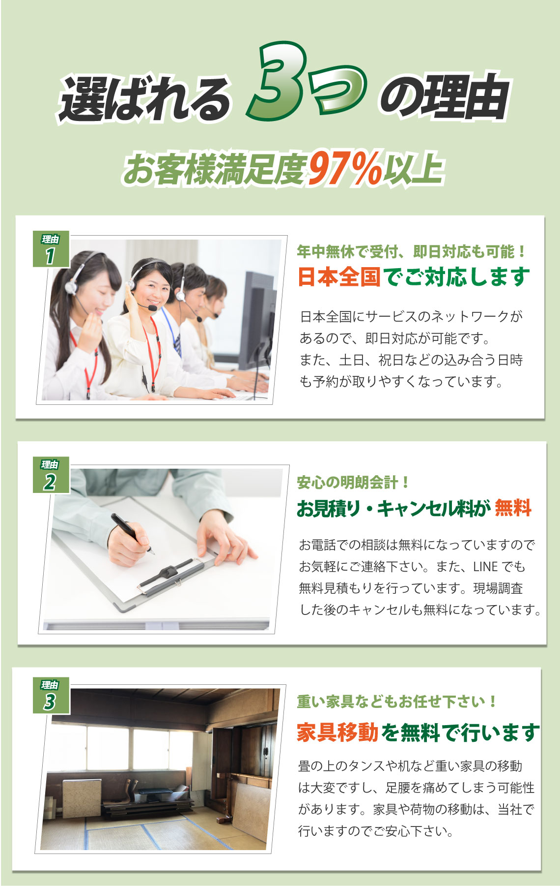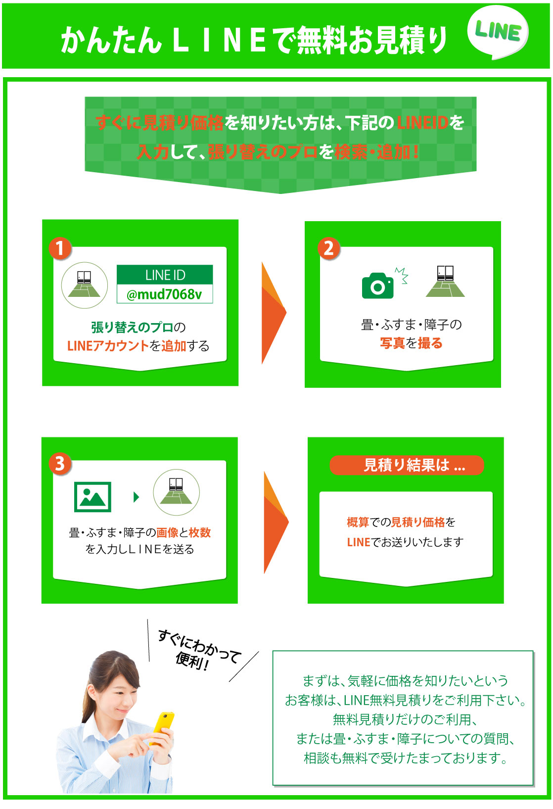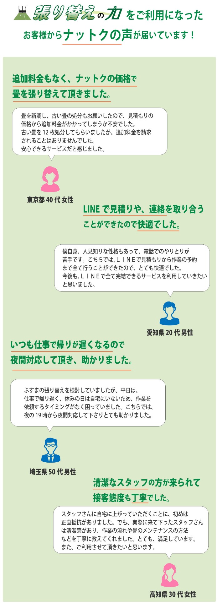 畳、襖、障子の経年劣化(破れ、汚れ、日焼け、変色など)が目立ってきたら、張替えが必要になります。しかし、張替えといっても一年に何度も行うものでもないので、なじみがない、不安といった方も多いのではないでしょうか。わからないからと適当に依頼してしまうと思わぬ出費になってしまうこともあります。そこで畳、襖、障子の張替えを適正料金で安心して依頼するためのポイントをご紹介します。張替えは畳(襖、障子)の状態や数量などによって、それぞれ対応が異なるため、一律で何円とは言えません。ただ問い合わせの前におおまかでいいので相場を調べておくと料金のイメージがつかみやすくなります。そして、まずは気軽に問い合わせをしてみましょう。多くの業者が無料で相談を行っています。ここで業者のヒアリング、回答、返答が丁寧で的確だと安心です。張替えを決めたら、必ず『無料見積もり』を利用しましょう。業者によっては見積もりで料金がかかってしまうこともあるので、事前に無料かどうかを確認しておくことをおすすめいたします。また、下見なしでの見積もりは追加料金の発生につながるので、下見をしてもらった上で見積もりをしてもらいましょう。いきなりの下見は不安といった方は、張替えを行う畳(襖、障子)の写真をLINEやメールなどで送付することによる『web見積もり』を行っている業者もあるので利用してみましょう。そして、見積もりは一社に絞るだけではなく、数社で比較することをおすすめいたします。比較する際は、見積もりの細部まで確認しましょう。材料費、作業費、追加料金は発生しないかなど、わからないことは業者にしっかりと聞きましょう。畳、襖、障子の張替えを適正料金で依頼するためには、業者との密な打ち合わせが重要です。優良な業者であれば、お客様に最適な対応を行い、より格安、低価格で張替えを済ますこともできます。適正料金で依頼して、気持ちよく、スムーズに張替えを済ませたいですね。